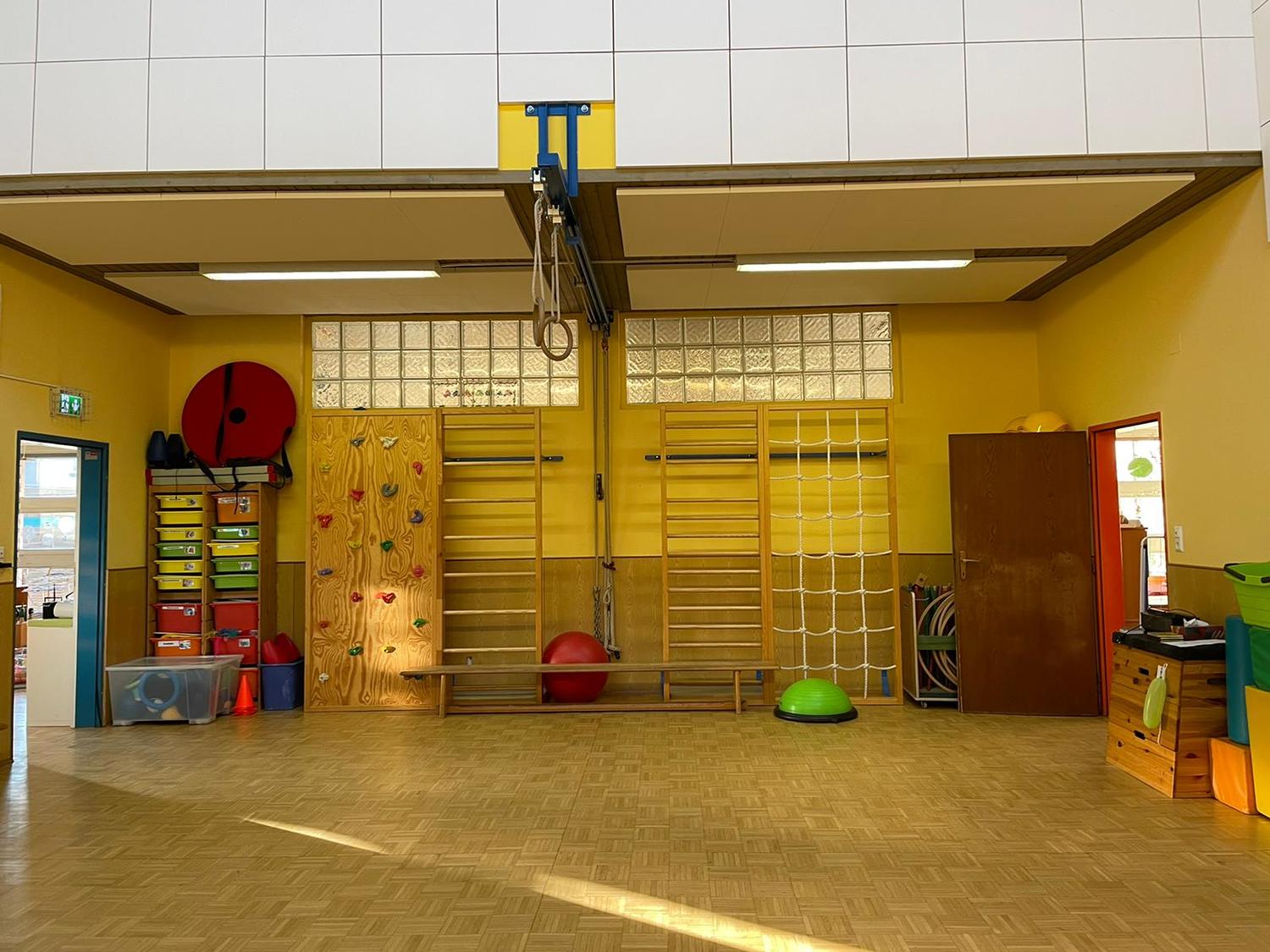 Unser sehr gut ausgestatteter Turnsaal, welcher von beiden Gruppen zugänglich ist, lädt zum Ausprobieren aller Bewegungsmöglichkeiten ein. Dadurch wird die Wahrnehmung geschult, das Koordinationsvermögen und der Gleichgewichtssinn gefördert, Körpererfahrungen ermöglicht und das Selbstbewusstsein gestärkt.