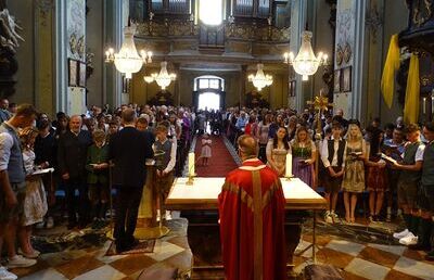 Ein übervoller Hauptplatz am Samstag Vormittag in Frohnleiten: es wird wieder einmal in der Kirche gefeiert! Dieses Mal ist es das Sakrament der Firmung. Pfarrer Ronald Ruthofer, wieder als Firmspender, begrüßte die große Festgemeinde. In seiner lebendigen Predigt thematisierte er Chancen und Risiken der Künstlichen Intelligenz und spannte den Bogen zur göttlichen Intelligenz, wie sie in der Tradition der Kirche in den sieben Gaben des Heiligen Geistes überliefert ist.